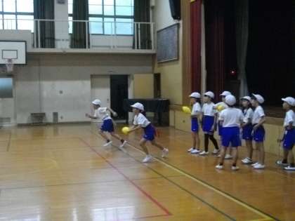 4年生が,体育館で体育をしています。楕円のボールをパスをしあいながらゴールまで運びます。腰に付けたタグを取られないように,工夫しています。