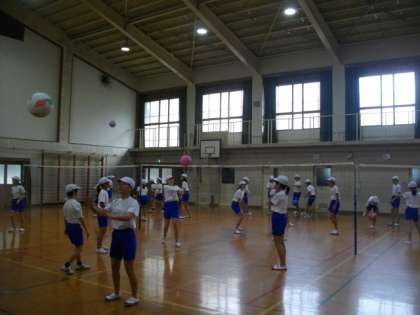 6年生が,1,2組合同で体育でソフトバレーボールに取り組んでいます。合同で取り組むことにより,いろいろなチームメイトと組んで,練習や試合ができる良さがあります。とても楽しそうに学習をしています。