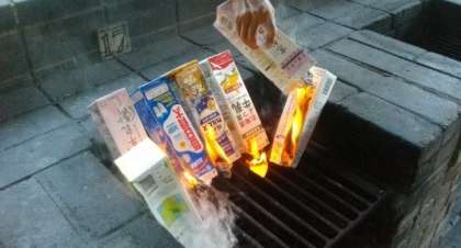 キャベツとソーセージをはさんで、牛乳パックにいれて焼きます。パックドックは、花背山の家オリジナルメニューです。