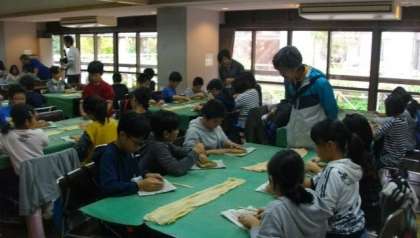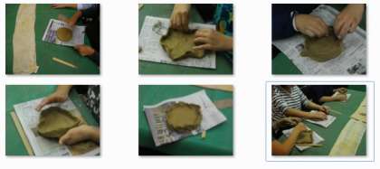 花背焼きを作ります。1200度の高温で焼き上げるそうです。「空気が入ると割れてしまいますから気をつけてね。」の言葉にちょっぴり緊張しながら取り組んでいます。真ん中をトントントン…とはいうものの、1回ではなかなかうまくいきません。いろいろな形作りにチャレンジしている子もいます。