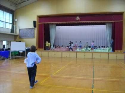 1年生が,ドリルを使いながら漢字の学習をしています。今日は「三」の字を練習しました。2年生は,舞台を使いながら,学芸会の練習を進めています。