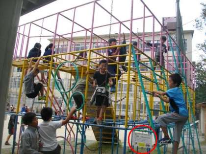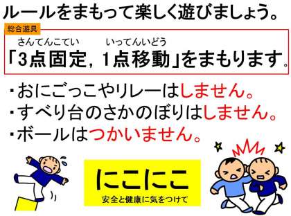 中間休みにたくさんの子どもたちが外で遊んでいます。総合遊具を使って安全に遊べるように掲示をしました。子どもたちは,それを見ながら,楽しく遊んでいました。