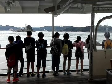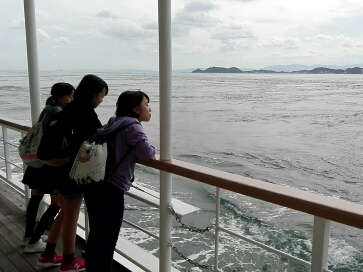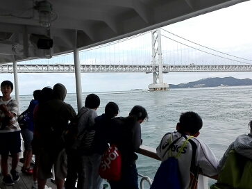 「日本丸」から渦潮の見学をしました。とてもたくさんの渦が見えたので,子どもたちの歓声が上がっていました。