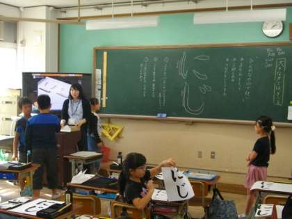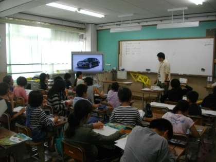 5年生は,社会科で,自動車の輸出入について学習しています。3年生は,習字で「にじ」をはらいやはねに気をつけて書いています。