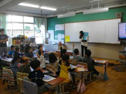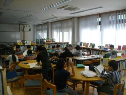 1年生は国語の学習をしています。5年生が,図書館で本を読んでいます。