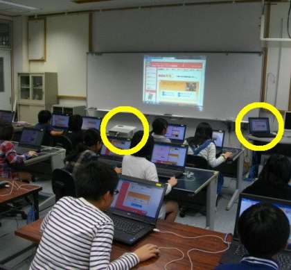 (教師用のPCを常時液晶プロジェクターに接続していますので,電源を入れるとすぐに教師機の映像が投影できるようにしました。)
