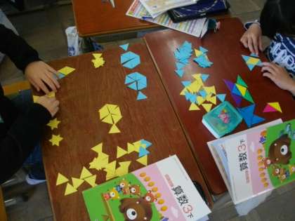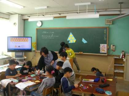 3年生が算数科で三角形のしきつめに取り組んでいます。