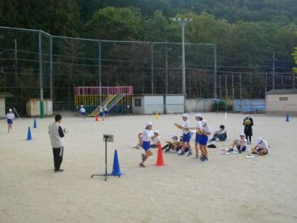 6年生は,運動場を走っています。一周何秒で走るのか,自分のペースを意識して走っています。
