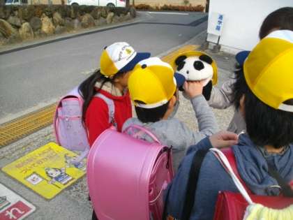 子どもたちが登校してきました。毎朝,「いちはらぱんた」さんの口に手をいれて,噛んでもらっているお友達がいます。