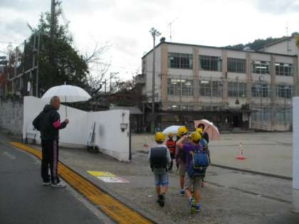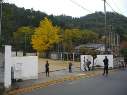 ときおり雨が降っています。子どもたちが登校してきました。11月になり,木々が色づいてきました。