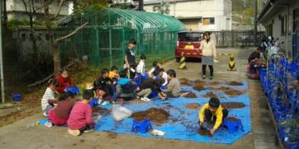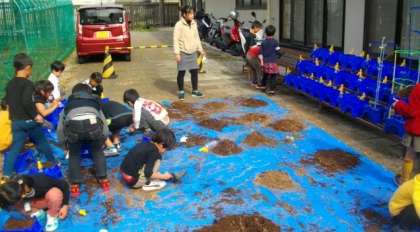 1年生が植木鉢の準備をしています。