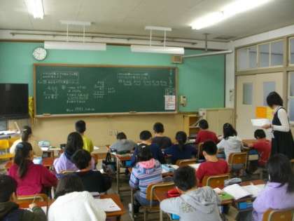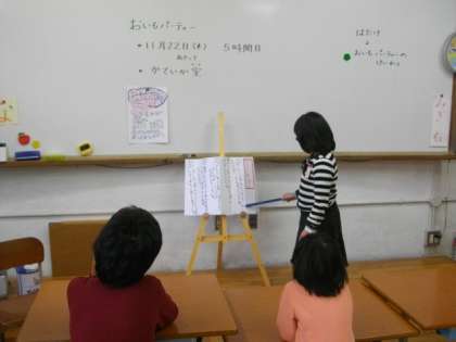 3年生は,算数で筆算の学習をしています。3組では,あさってに実施する「おいもパーティ」で,どのような調理をするのか,手順を書いた紙をもとに発表しています。