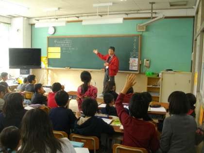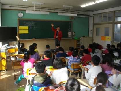 3年生が,理科で光のすすみかたについて合同で学習をしています。昨日,運動場で行った実験の結果を発表しています。