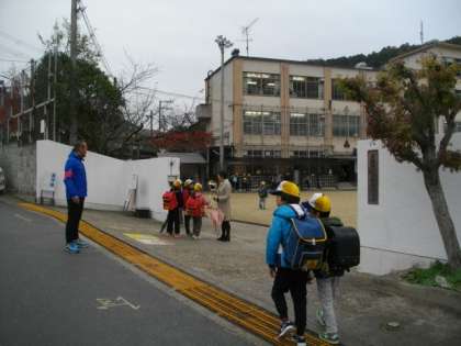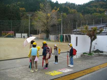 時折小雨が降っています。子どもたちが登校してきました。
