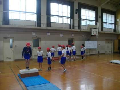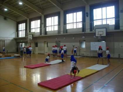4年生は,体育でマット運動に取り組んでいます。いろいろな場の設定をするなかで,側転や開脚前転,後転の練習をしています。