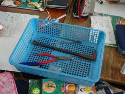 くぎを抜く道具を使って,「力点」と「作用点」そして「支点」と順に指差しをしながら確認していきます。体験をしながら考えることはとても大切です。(この道具を使ってくぎ抜きをしたことがない子どもたちが,全体の5分の1くらいありました。確かに「くぎを抜く機会」というのは,そうないのかもしれません。)