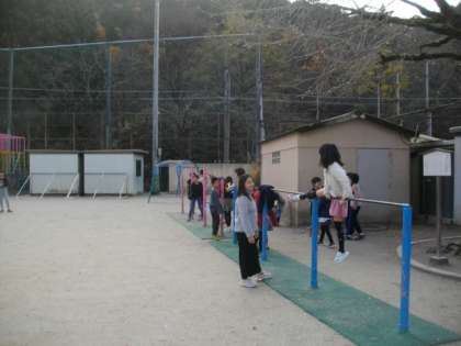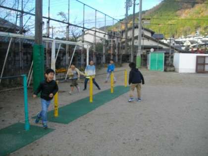 運動場では,一輪車に乗ったり鉄棒をしたり鬼ごっこをしたりしています。