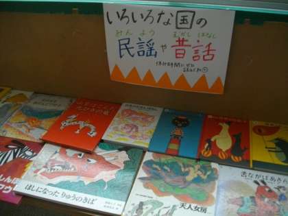 いろいろな国の民謡や民話・昔話に関係する本を3年生の廊下に展示しています。