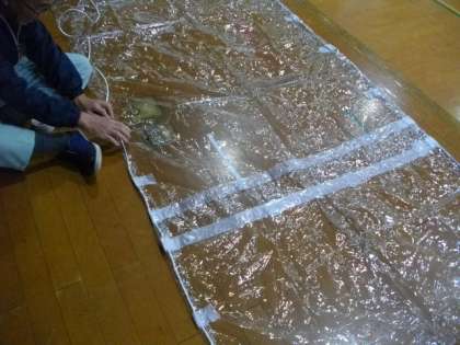 PTA役員の方から,透明ビニルシートをいただきましたので,つなぎ合わせてウサギ小屋を囲うフェンスを作っています。ウサギたちも,少しはあたたかくすごせるのではないかと思います。