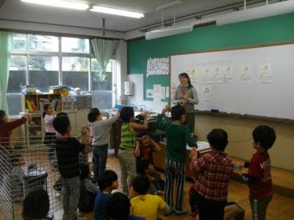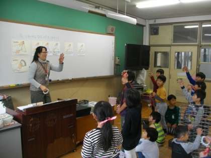 1年生が音楽の学習を進めています。すずをもって,先生が見本になって,リズムのまねっこをしています。