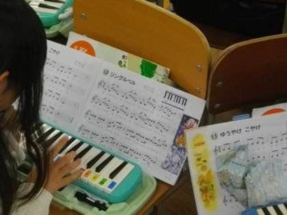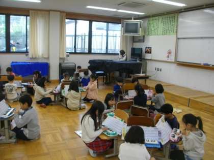 2年生が音楽室で,鍵盤ハーモニカの練習をしています。