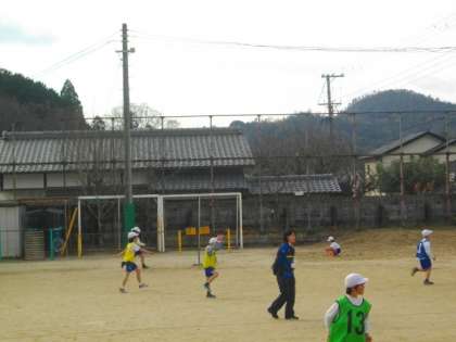 2年生が,運動場で体育をしています。声を掛け合って,元気いっぱいに活動しています。