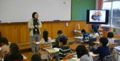 1年生の学習の様子です。日本の昔話・世界の昔話を紹介すると,さっそく本を手にとって読み始めています。