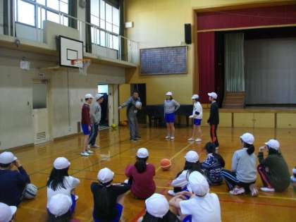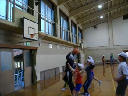 6年生が,体育館でバスケットボールに取り組んでます。