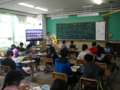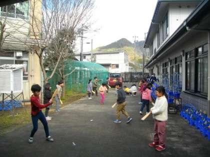 1年生が昔遊びに親しんでいます。4年生は,社会科で都道府県について学習しています。
