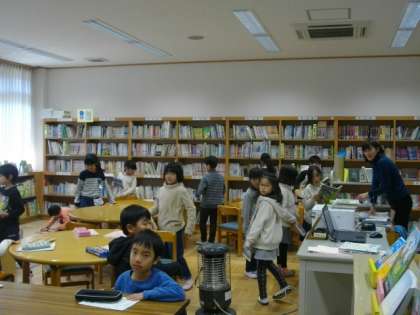 2年生は,図書館で本を借りています。4年生は,コンピュータで文字入力の練習をしています。