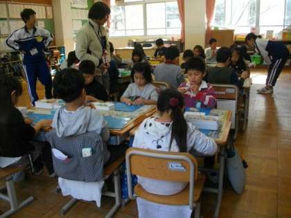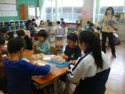 1年生の学習の様子です。チャレンジ体験で洛北中学校の生徒さんがいっしょに教室にはいって,子どもたちの発表を聞いています。