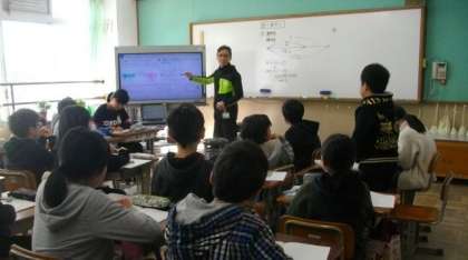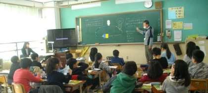 5年生は,割合を線分図で表しながら,「もとにする量」「くらべる量」といった言葉を使いながら説明をする活動に取り組んでいます。
