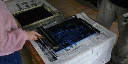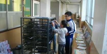3年生が,版画に取り組んでいます。チャレンジ体験で来校している洛北中学校の生徒さんが,作品の整理を手伝ってくれました。