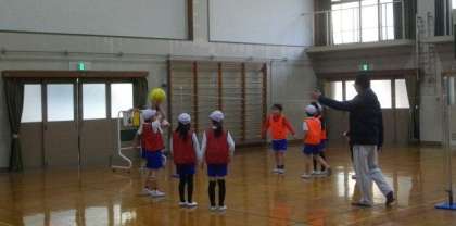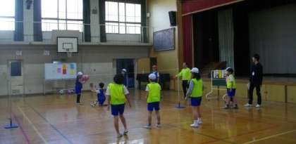 4年生が体育でソフトバレーボールに取り組んでいます。静原小学校のお友達もいっしょにゲームに参加しています。