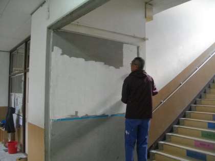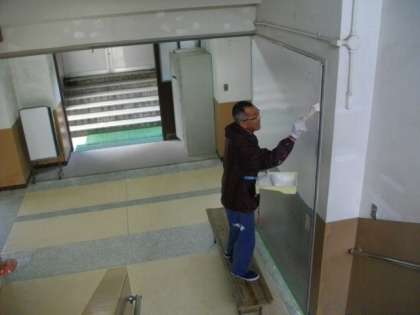 防火扉の塗装をしています。さびているところは,先に透明のシーラー(下塗り材)を塗布し,はみ出ないようにマスキングテープを貼った後,ローラーで丁寧に塗装をしていきます。