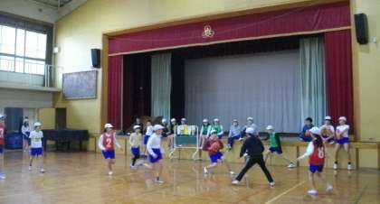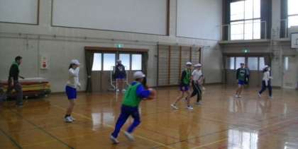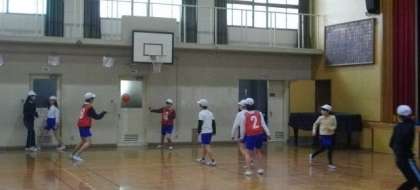 6年生の体育の様子です。バスケットボールのゲームで大いに盛り上がっています。