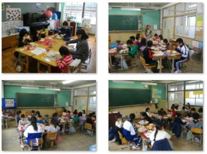 給食の時間の様子です。チャレンジ体験で来校している洛北中学校の生徒さんも,子どもたちといっしょに食べています。先生方も,各教室にわかれて子どもたちといっしょに楽しく食事をしています。