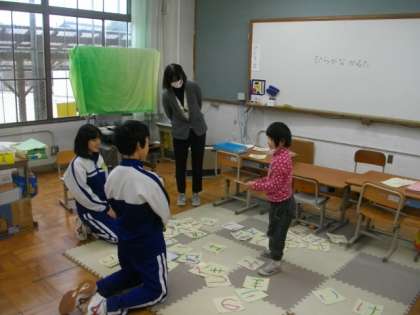 3組は,ひらがなをつかって言葉集めをしています。洛北中学校の生徒さんも活動を見守っていました。