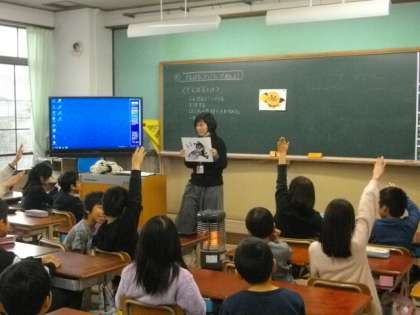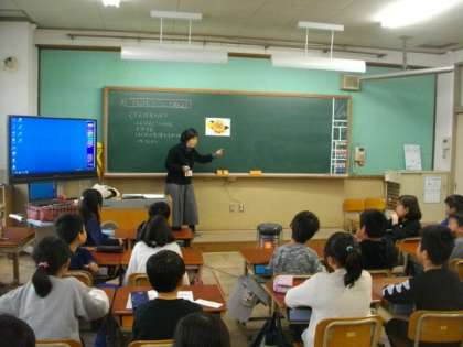3年生が,アニメのキャラクターを教材にしながら「自分にできること」について話し合っています。今日の6時間目に,1年生の先生が授業をしてくださいました。