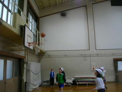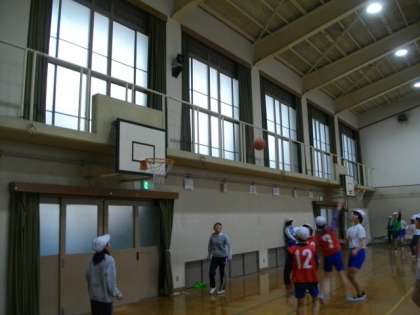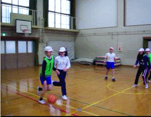 6年生が体育でバスケットボールのゲームをしています。