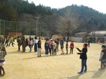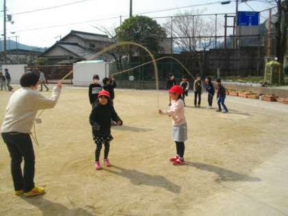 大なわとびをして遊んでいる子どもたちがたくさんいます。