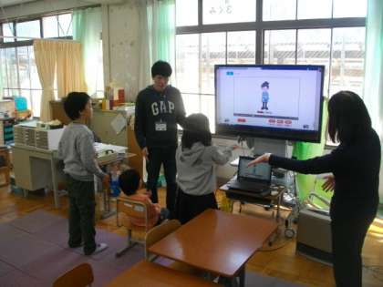 3組は,外国語を使った学習を進めています。リズムに合わせて,声に出したりジェスチャーをしたりしています。