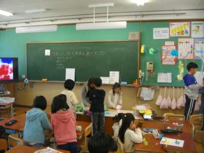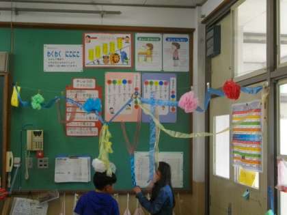 2年生は,図画工作科で「つないでつるしてかざろう」をテーマにして教室の飾り付けを工夫していました。