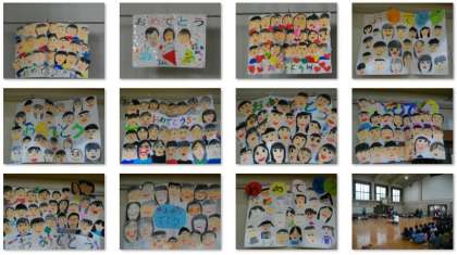 各学級で作った,六年生の卒業をお祝いする作品が飾られています。
