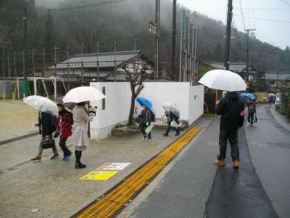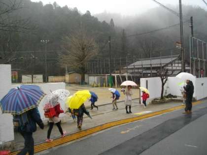 雨が降っています。子どもたちが元気よく登校してきました。