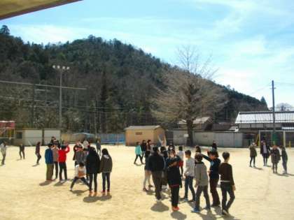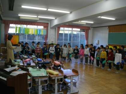 6年生は運動場で活動しています。1年生は入学式での発表練習をしています。