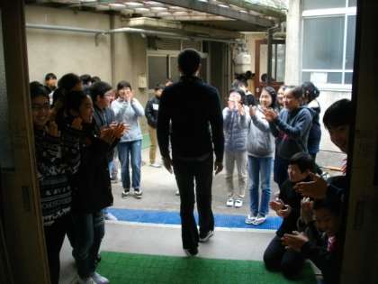 退場の練習では,担任の先生が見本を示していました。