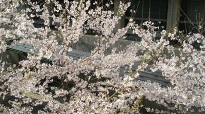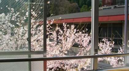 新館の2階窓からは,桜の花が手にとれるくらいのところで咲いています。