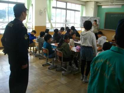 1年の交通安全教室が終わったあと,警察の方や地域の方に,いくつかの教室の学習の様子を見ていただきました。