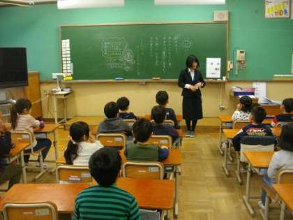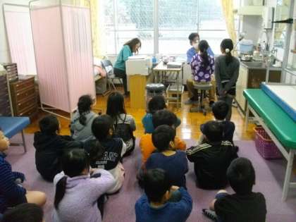 1年生は,名前を呼ばれると,「はい,元気です」と元気よく返事をしています。お話を聞く態度も立派です。